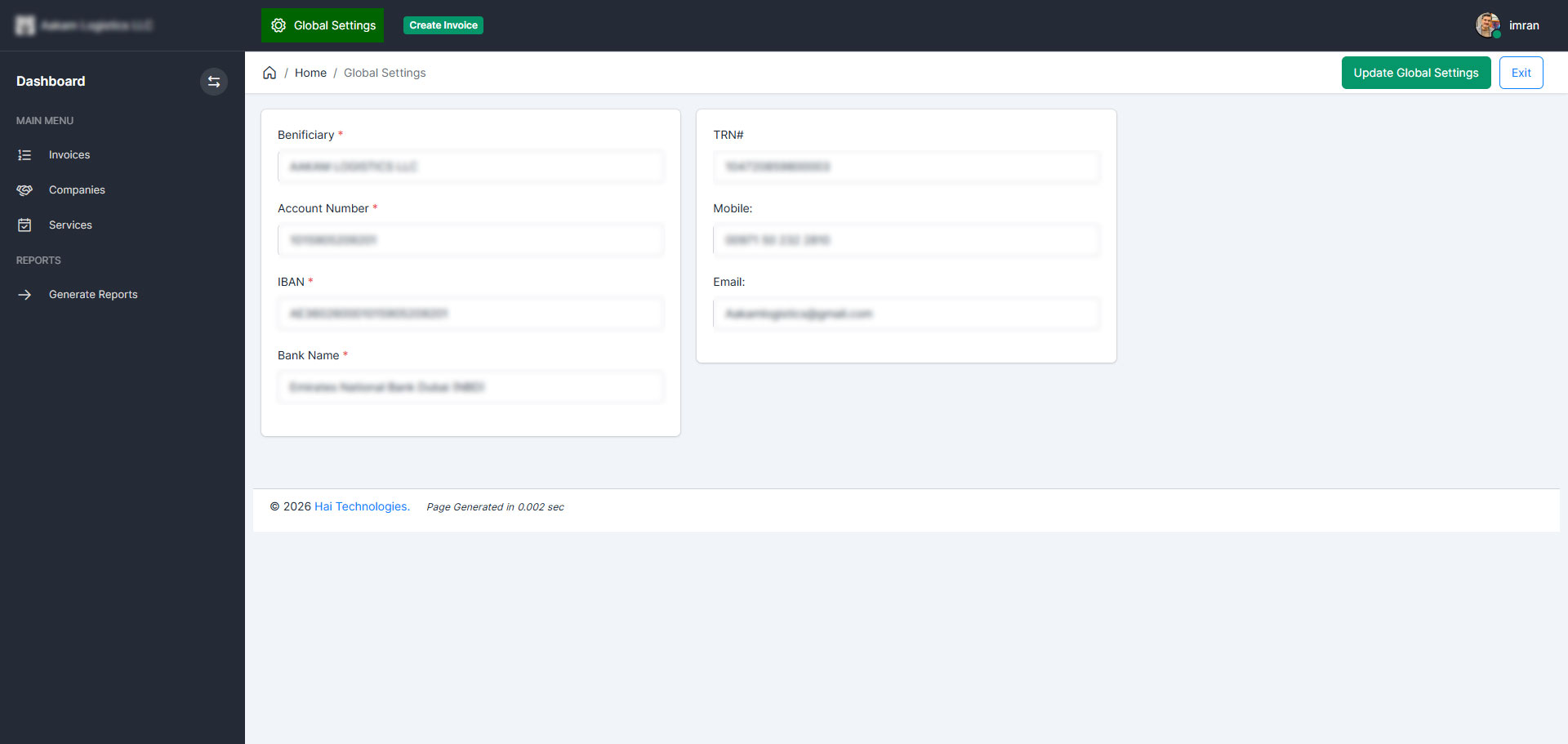 - TRN display and tax breakdown
